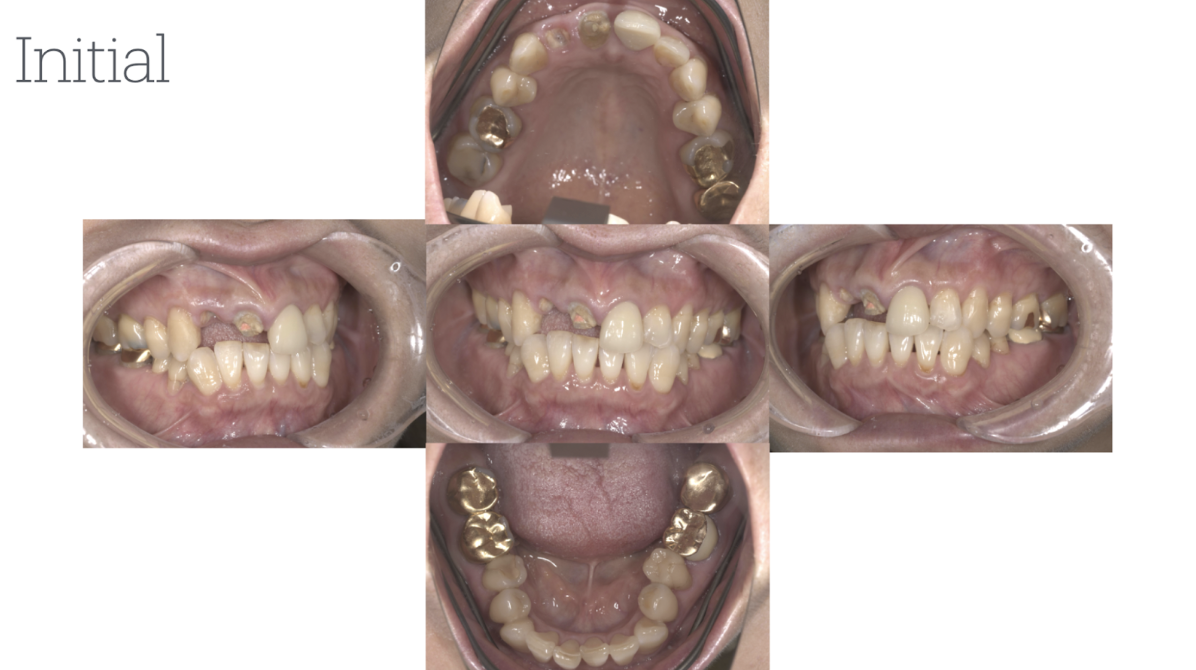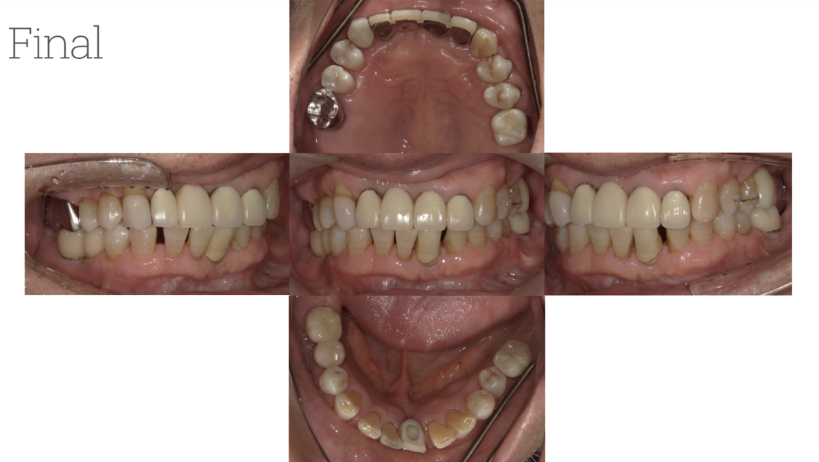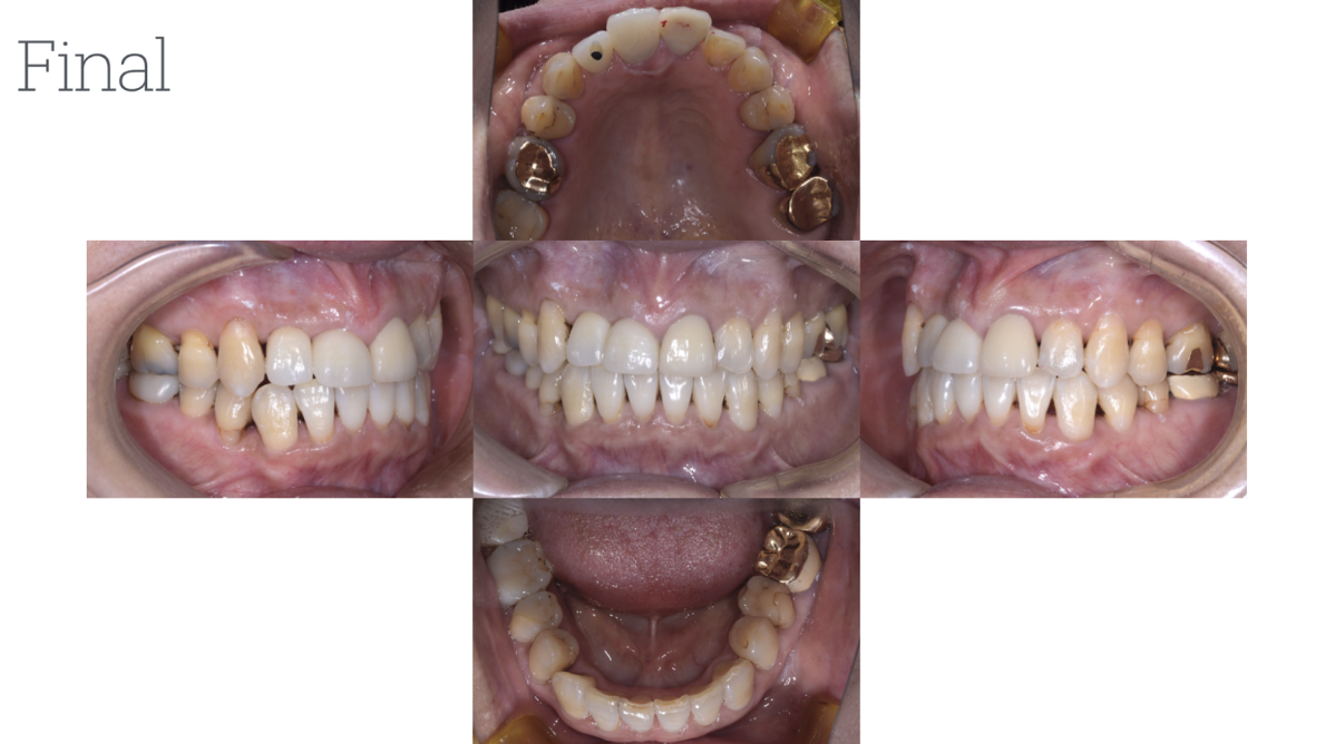 主訴:定期的なメインテナンスを長年行ってきたが、前歯が揺れ始め、奥歯が噛めない状況になったため、当院にて相談。このままでは歯を失うリスクがあったため、全顎的な治療を希望。まずは、奥歯が噛めるように矯正治療を開始。同時に歯周治療を徹底的に行った。その後、保存不可能な歯は抜歯を行い、インプラント治療・被せ物による噛み合わせの調整を行った。現在、治療後定期メインテナンスを行ってい、安定した状態を保っている。