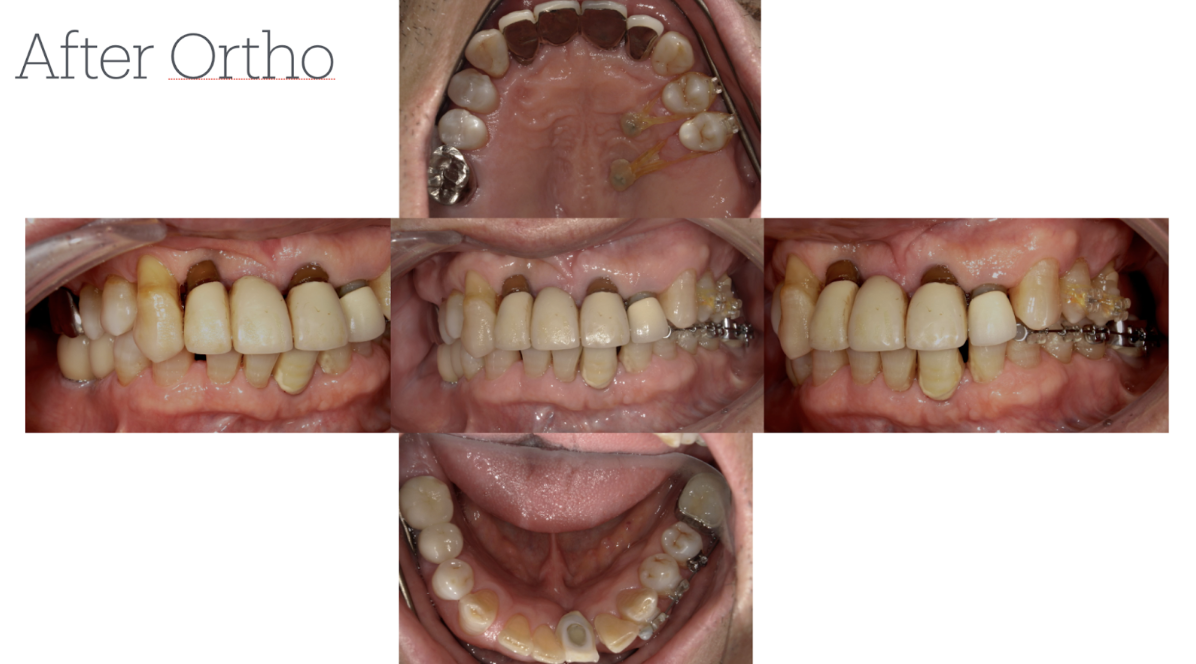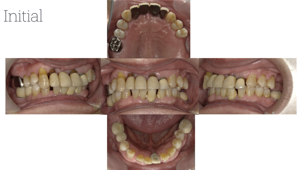 主訴:定期的なメインテナンスを長年行ってきたが、前歯が揺れ始め、奥歯が噛めない状況になったため、当院にて相談。このままでは歯を失うリスクがあったため、全顎的な治療を希望。まずは、奥歯が噛めるように矯正治療を開始。同時に歯周治療を徹底的に行った。その後、保存不可能な歯は抜歯を行い、インプラント治療・被せ物による噛み合わせの調整を行った。現在、治療後定期メインテナンスを行ってい、安定した状態を保っている。