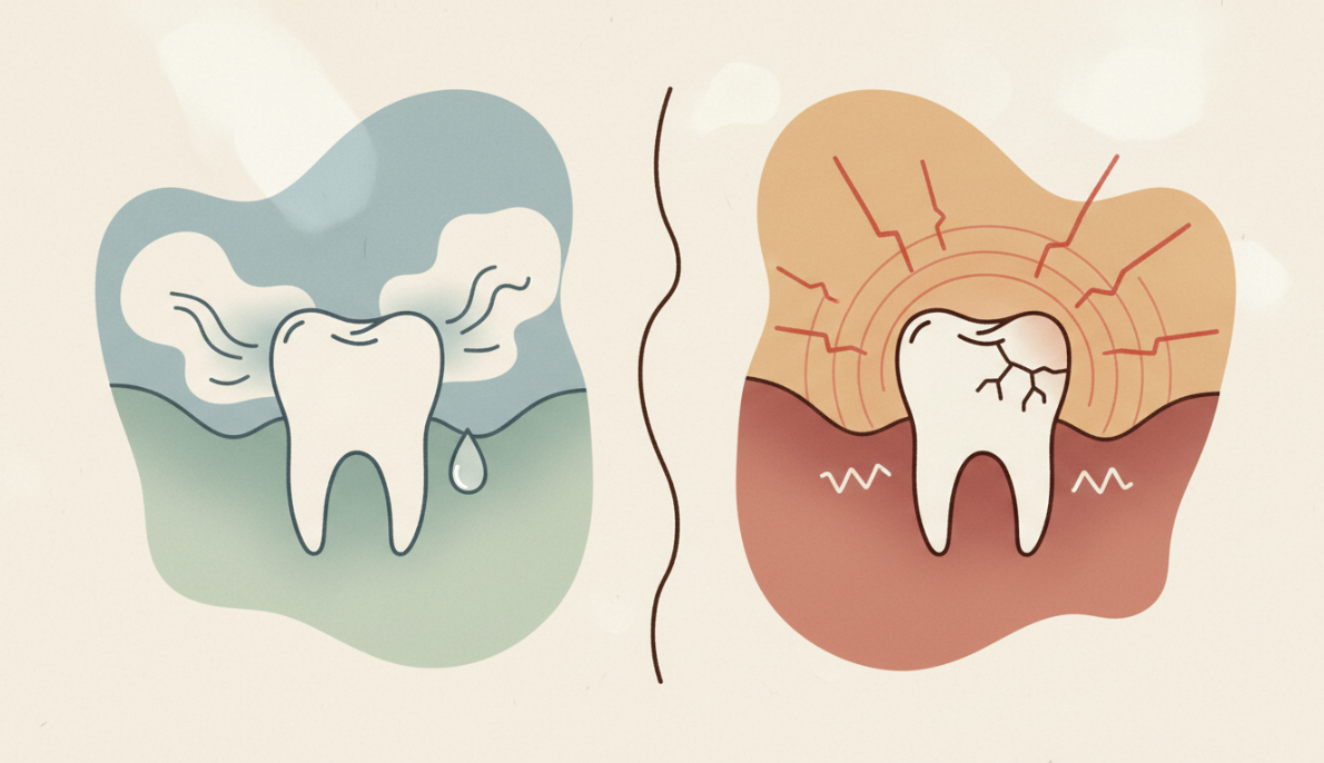強い痛みがあり、冷たいものや温かいものでしみる場合やズキズキとした痛みが続く場合、神経が炎症や感染を起こしている可能性があります。